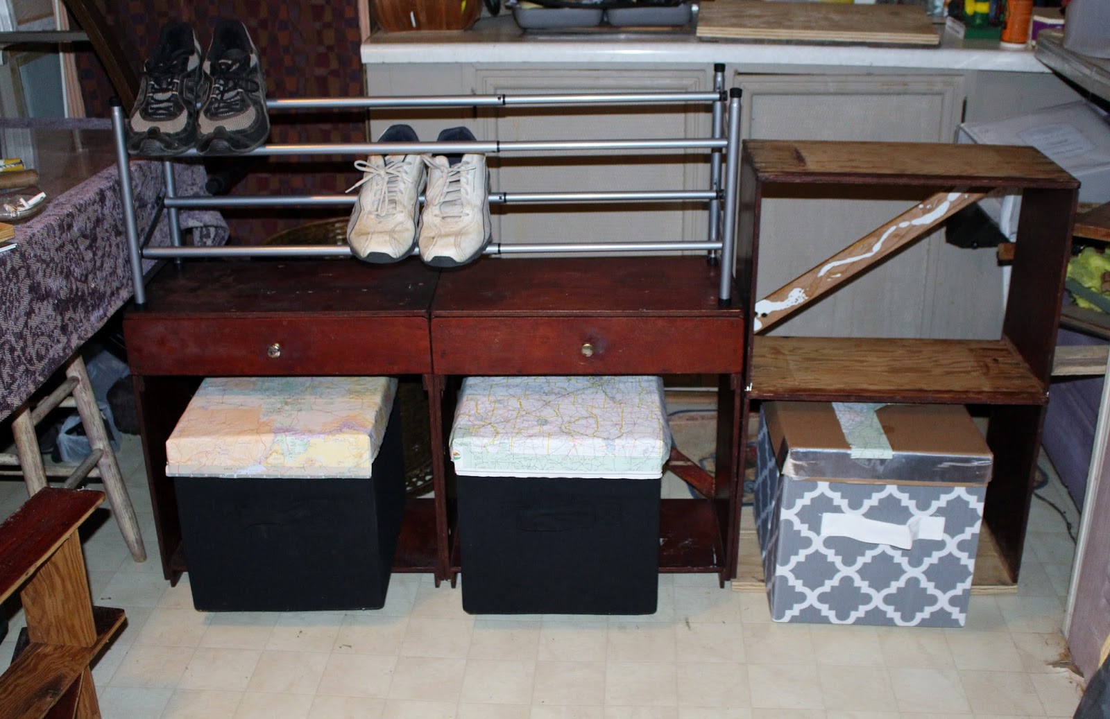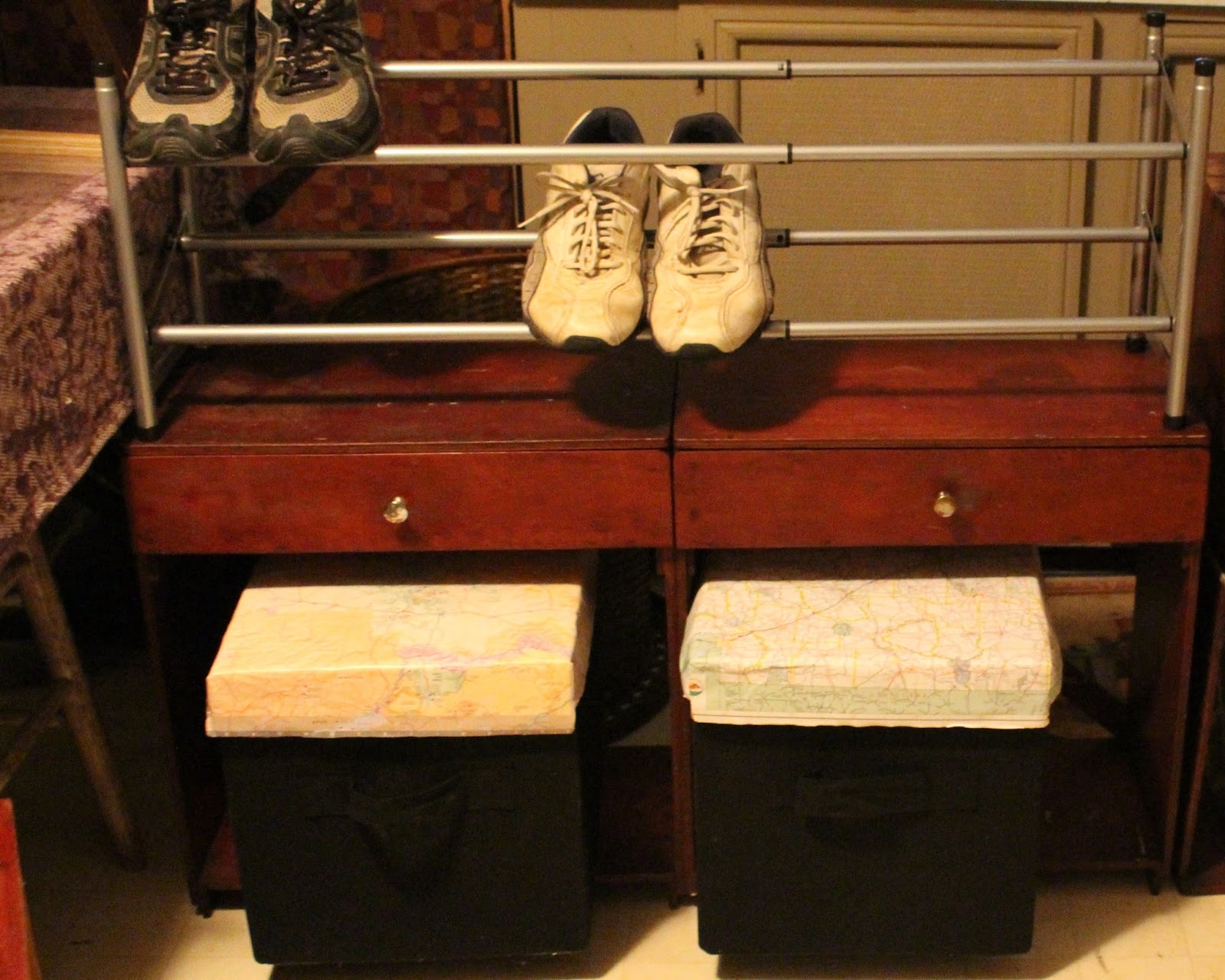 It's WalMart's fault!! I saw a nice shelf with four boxes for only $149...boxes not included. Silly me, thought, I can do that. The twin shelves jumped out at Salvation Army and came home with me. Shelves...$6, boxes...$15 for three...shoe rack...$8(a bad idea) and the idea was born, Slowly, painfully, but born nonetheless. So for a mere $29 I have solved a problem with the rest of the material on hand and I have two drawers. Walmart's didn't have that!
