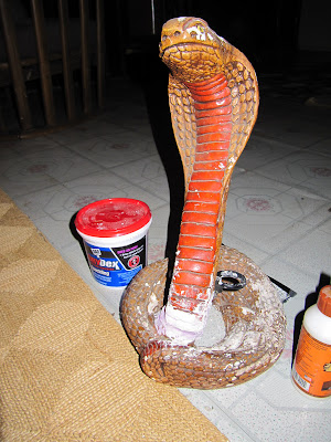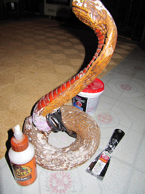 So repairs progressed.  Spackling and glue drying on my hands.  A little sanding, some carving of snake scales, and a new creative coat of paint and Cobra will rejoin my collection of fun.