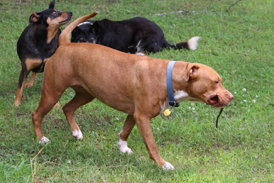 One day Hubby saved Rooster from an all out attack by the rogue pair.  Later I notice they were sneaking their way back toward Rooster and big bad Pit Bull Bonnie gently herded the bad guys toward their territory.  It was a site to behold.  Bonnie has never been trained to herd. Like a good farm dog, she recognized a need to protect and gently removed the problem.