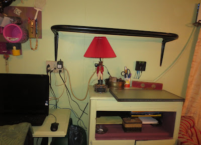 Yep, that's a shelf. This is the broken side rail to Andrew's black bed. Hubby helped me drill holes into the heavy metal and attached my painted shelf brackets. I have a plan here and I swear they are getting better. Remember that thing I built to hold pens, glasses etc. I called it a prototype I believe. Well, it's going back to the drawing board. I still have too many wires!!!Ta daaaa! My sneaky way to hide the wires. If you squint you can't see the hose and the other wires are covered by the material...and the mess is gone. Well, not gone but it is much neater.