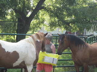 When I returned to the kitchen for the second load of treats, I thought, I need to gather all the halters, ropes and bridles and sort them for each animal.  I dumped my gear bag in the middle of the dining room (remember, that's where my saddles are) and decided to make a hanger for all the head gear in the dining room.  That's right!  Where we eat!  Hey, this is a working farm, not a fancy magazine place, where nothing is ever out of place.  Now, they are all in place, I made a hanger using old door knobs and a two by four.  How's that for fancy?  Charme wears purple, Arrow; black, Knot; red and Magic; blue(he's a Patriotic horse...red, white, and blue)  All halters, leads, bridles are all in place...wait a minute...where the hell is my blue halter??