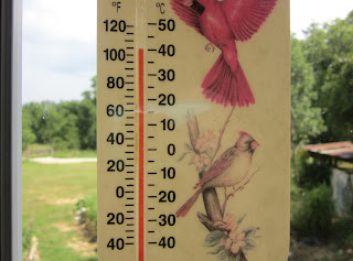 So here are the temps that greet me by nine o'clock.  All my outside adventures are literally melting before my eyes.  I have been up since five but other things demanded my attention...the normal crap assigned to women, dishes, gathering things, starting laundry, etc. I really shouldn't complain because while outside doing other things, hubby is making hashbrowns from scratch, ham, and eggs for breakfast (at eleven am).
