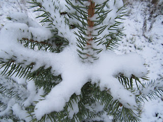 Rows of pine needles covered with snow.