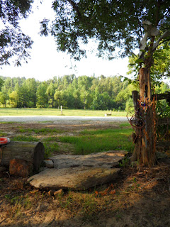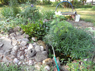 I had topped off the water garden, removed a bag of mortar from the car to work on my rocks...bag's been there six months...and while there, I had to bring a blanket and a sweater in to wash, also in the trunk.  I have a sand and rock deck below my porch and have decided it needed mortar.  Note the big rock that is the center, compliments of  always-do-it-big hubby.  Siding-tracking always throws me off, see something that needs doing, do it, and go back to first job later.