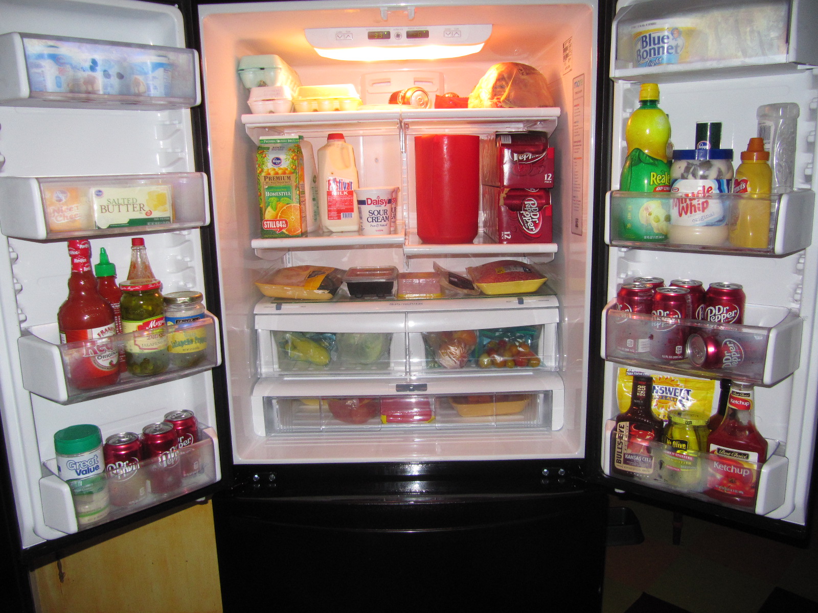 Yep, sent the guys, that's right the guys, to get a fridge. Our old one was on its death bed and just honestly wanted the guys gone, out of my hair. I was still trying to work outside...I got lots of phone calls. Do you care about the color, do you want an ice maker, bottom freezer okay? I said I don't really care as long as it works and doesn't cost three thousand dollars. So the guys took it seriously. This is the beauty I got for under a thousand.