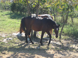 The horses look for fallen persimmons in the early morning sun. This is a prized treat for them and sometimes we shake the tree where more will fall.