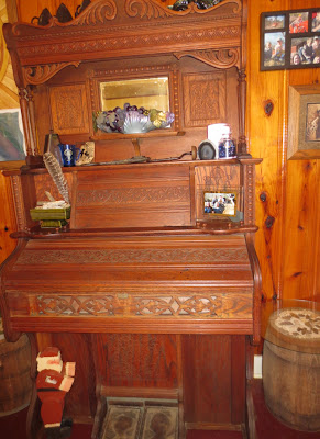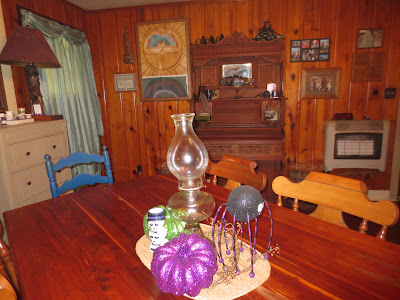 The Dining Room is large in the old farm house. The walls are natural pine, grown, cut, milled and seasoned here At The Farm. It is a large room as dining rooms go and has plenty of room for the extras I like to have in here like Granny Pruett's pump organ and the huge table Mom and Dad had made out of red cedar and black walnut. I don't think I could ever part with these.My added decorations here are rather different too. On the organ are three sad irons from the family, stones, old tools and a Shirley Temple pitcher from Hubby's parents, a cow bell, pictures, an old piano lamp and some other odd and ends.
