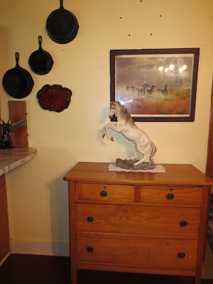 This is the wall where the organ used to set. I have simplified the decorations. The chest is old and contains some essentials and holds a favorite statue. The iron skillets are for use, the tiniest is my cornbread skillet. The old framed print a gift from a friend. In the fifties you received a free canvas print when you filled up your car in Georgia.