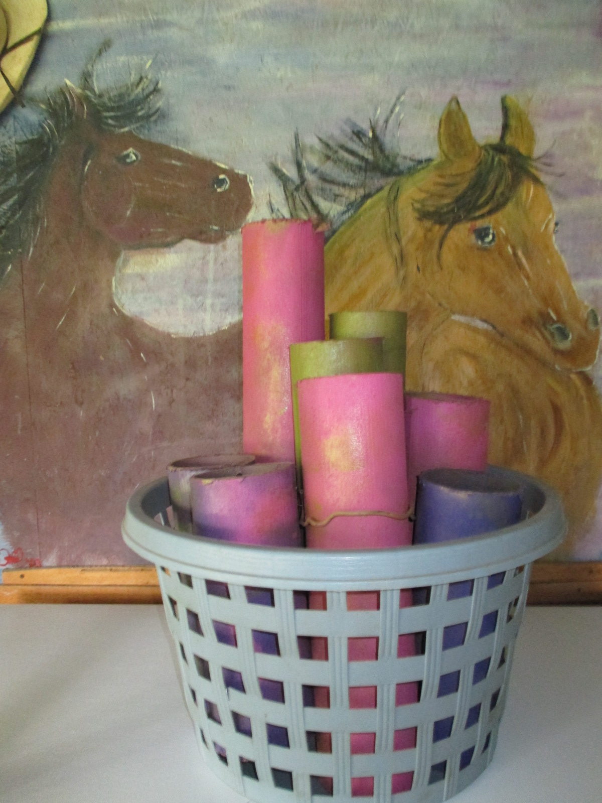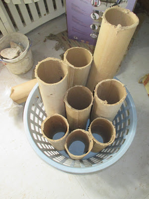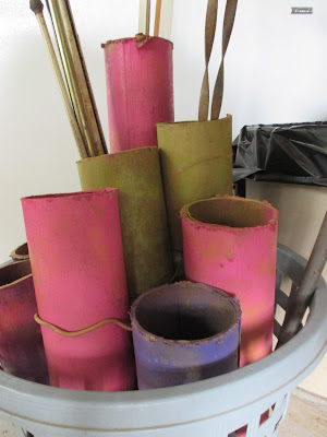 The circle that holds my paper is a mosaic covered coffee can which has seen it's better days. It began as a coffee can then graduated to decorated flower pot and was sitting useless. Now it holds my paper. The yellow is a cap from a can of ExpandaFoam and the two square boxes are tea containers. The small one has the lid attached to the board and you just pull the can off to access what is inside.