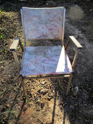 This chair is one of a pair of old office chairs from my screened porch.  I had recovered them with oil cloth but one had gotten wet.  Chip board does not do wet well.  Needless to say a bottom needed replacing.  I was having so much fun I failed to photograph that process.  Solid, recovered and will last much longer since we used plywood.