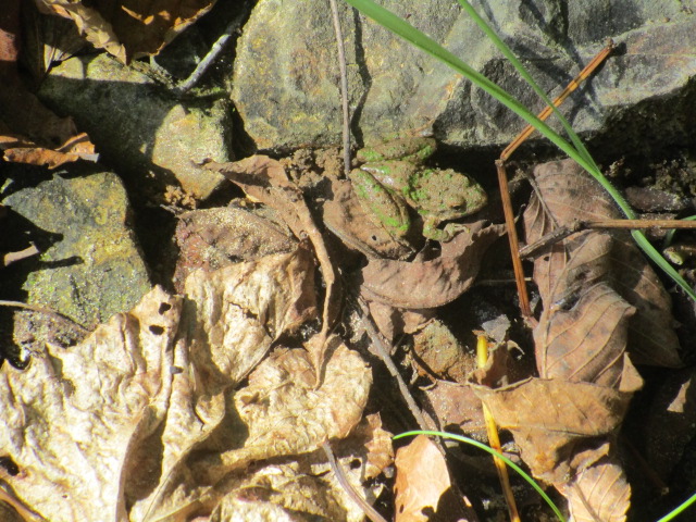 The dogs failed to see my tiny frog. There were several jumping in. The dry weather has thinned their swimming holes.