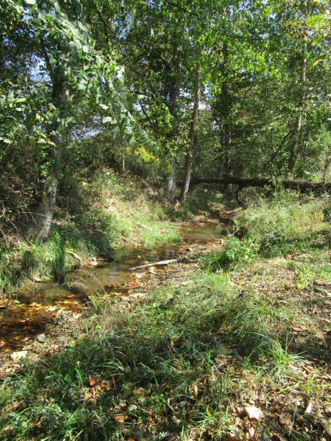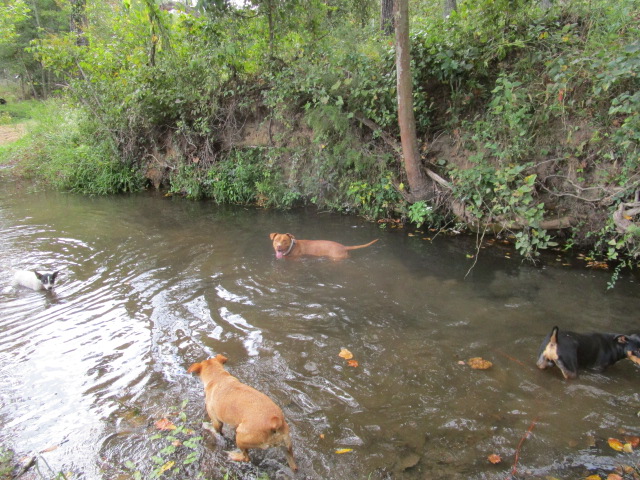 I always talk about how clear the water is but usually the dogs hit it before I get to show you. Here's a clear spot beginning to look like fall. A good gully washer or chuck floater would clean the creek out so it would not get as muddy.It doesn't stay clean long when the dogs cool off. Deep enough for some to swim. Lizzy is staying away from the deep water and tip toes through the shallows.