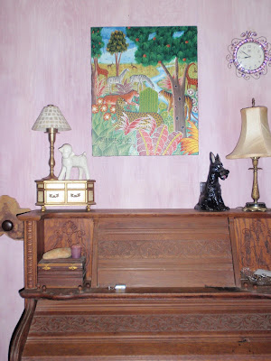 Chest and side table...yard sale years ago, lamp from Aunt Evah, painting by me, cedar wood cookie with old door knob to hang my purse on, made by me. Weird chicken, junk store. This is where I come home, empty my pockets, lose the ID from work and become myself.