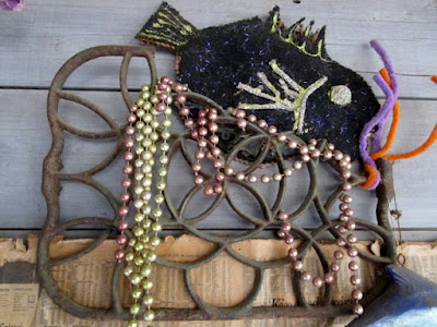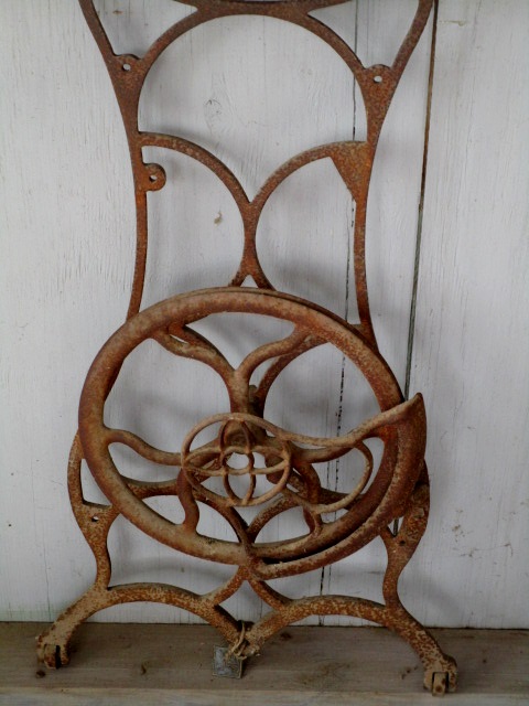 a felt fish on a broken treadle sewing machine peddle