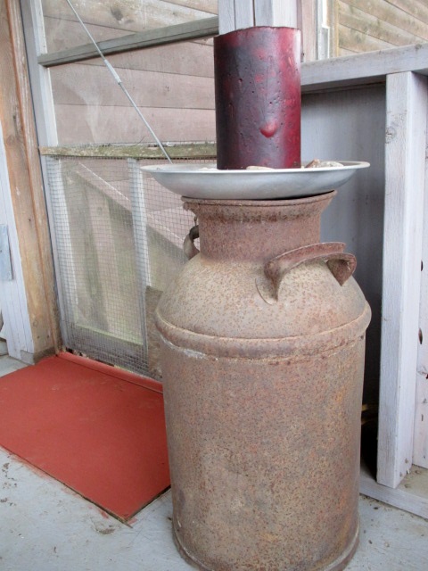 an old rusty milk can with a tray of rocks and a candle