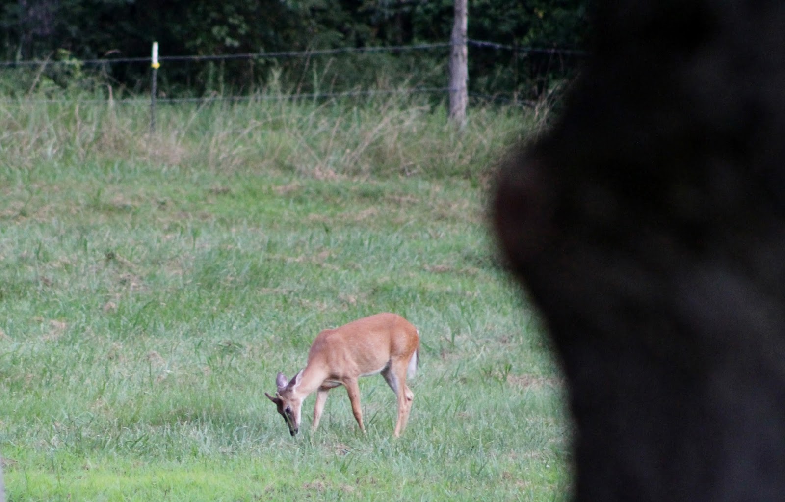 Last year's baby with velvet spike horns was grazing in the valley. I'm hoping the glass door is clean enough to see out. I'm being quiet so the dogs won't come running.