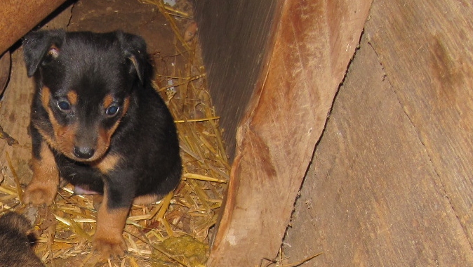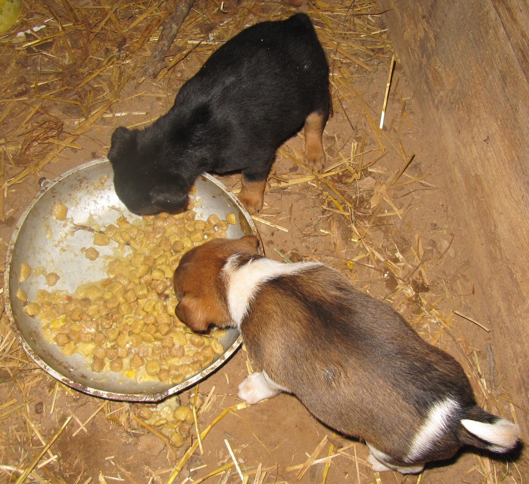 Ki-Anne, my hot pepper, eagerly shares a warm breakfast of nutritious dog food with eggs and home style gravy. No spoiling of these fat babies going on! Born December third, they have a mouth full of baby teeth and Ki does not welcome their drinking as readily as she did.