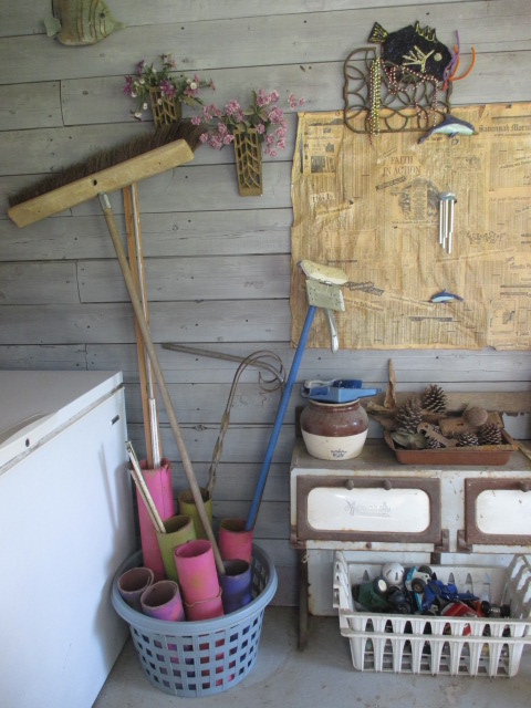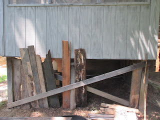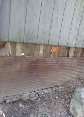 I continue to work on my new water garden.  I have "created" a visual rustic block enclosing under the screened porch by adding old tin and tiny scraps of board with one old vent cover along the top.  The weather has slowed my progress a little.