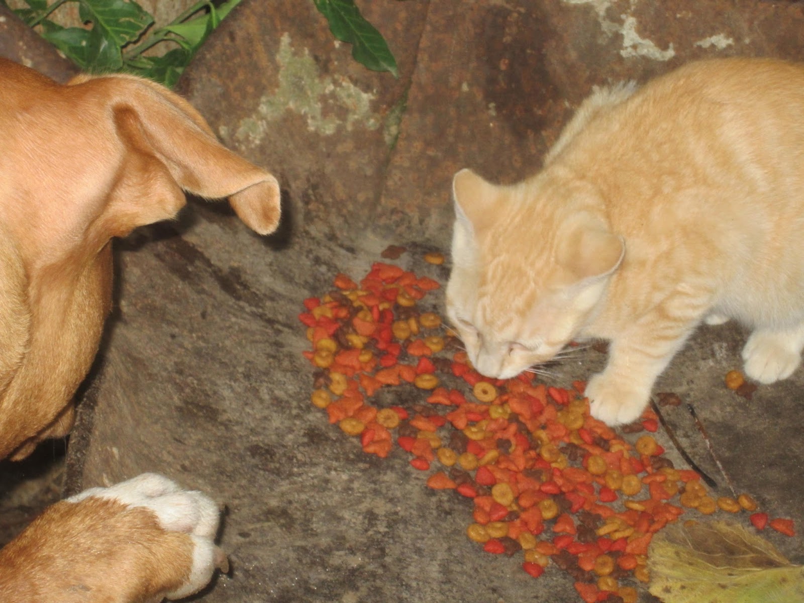 The cats share their food.